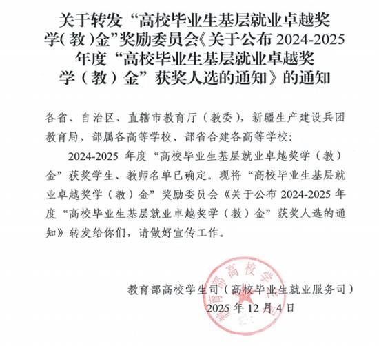 学校毕业生再次荣获全国高校毕业生基层就业卓越奖学(教)金