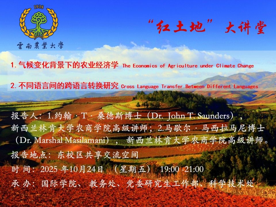 10月24日“红土地”大讲堂:1.The Economics of Agriculture under Climate Change,2.Cross Language Transfer Between Different Languages