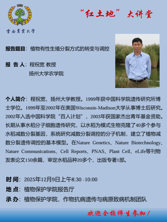 12月9日“红土地”大讲堂:植物有性生殖分裂方式的转变与调控