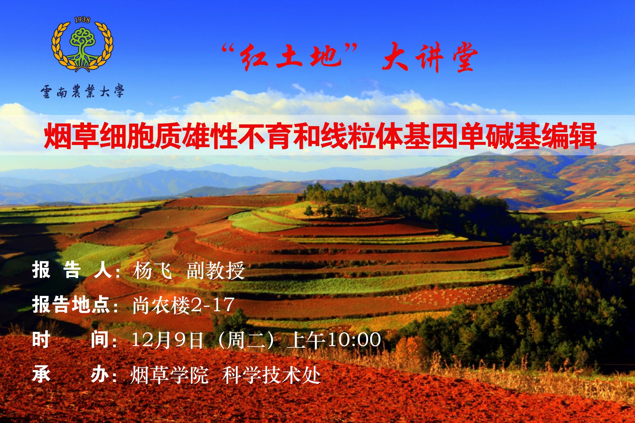 12月9日“红土地”大讲堂:烟草细胞质雄性不育和线粒体基因单碱基编辑
